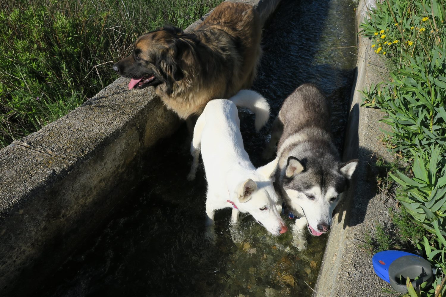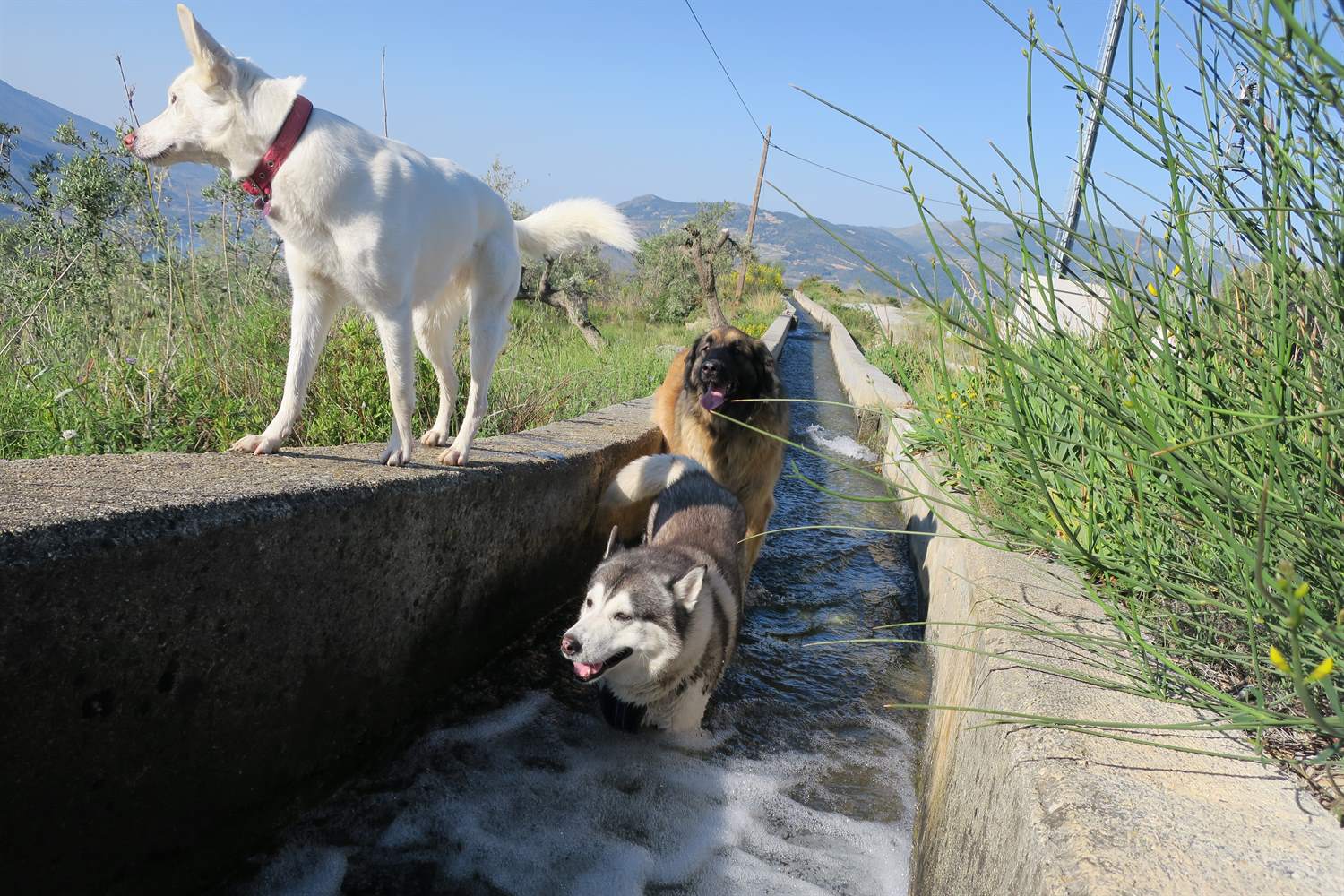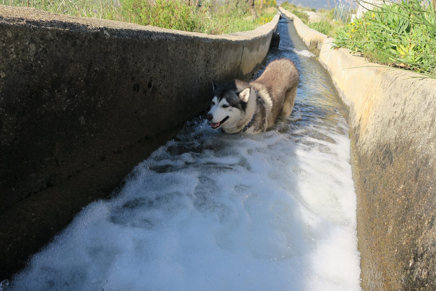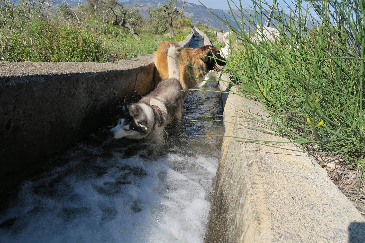 With temperatures rising to 28C (82F) today, our walk involved lots of water. We love to cool down in the water enroute. We are lucky to have the water flowing down from the Sierra Nevada mountains and into these irrigation channels. We know this won't last for the summer, just when we really need it. So we make the most of it for now.