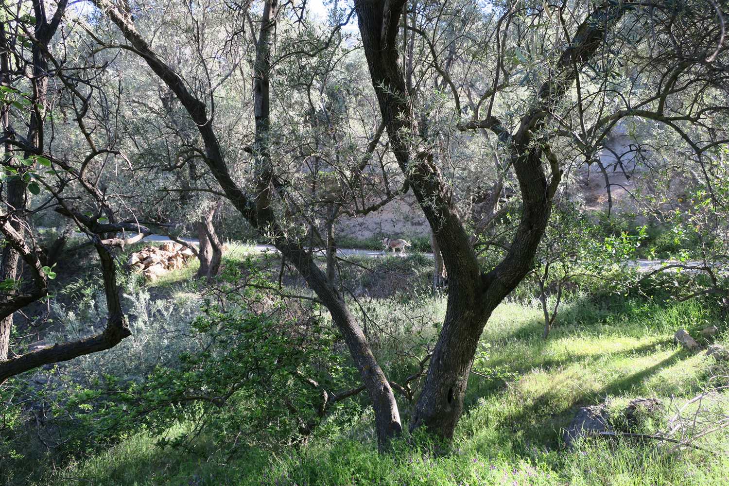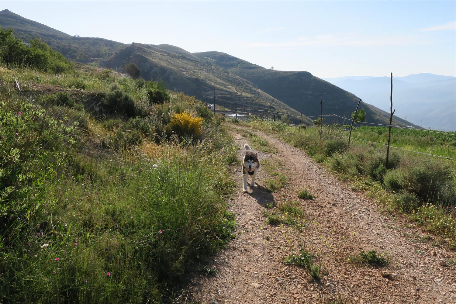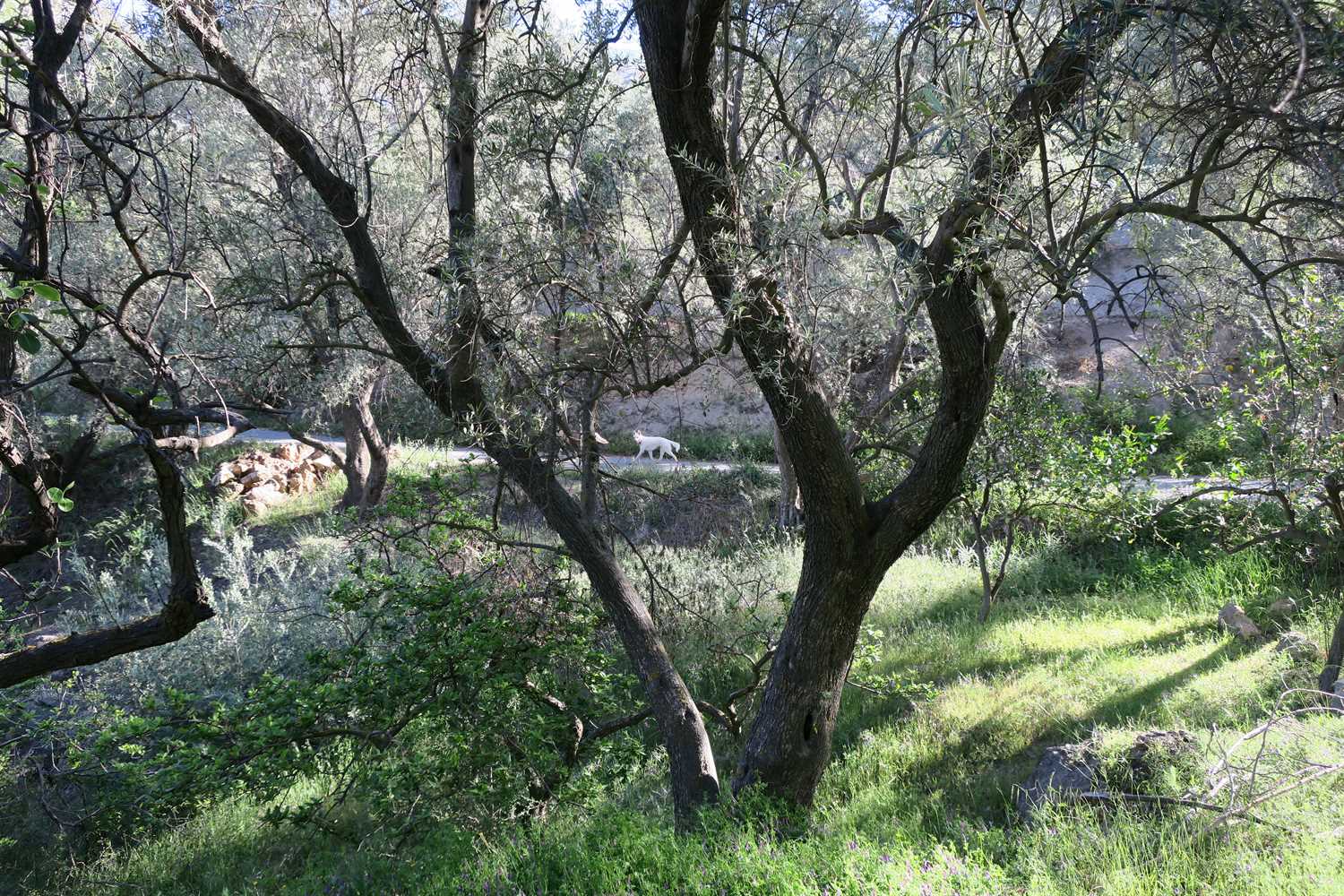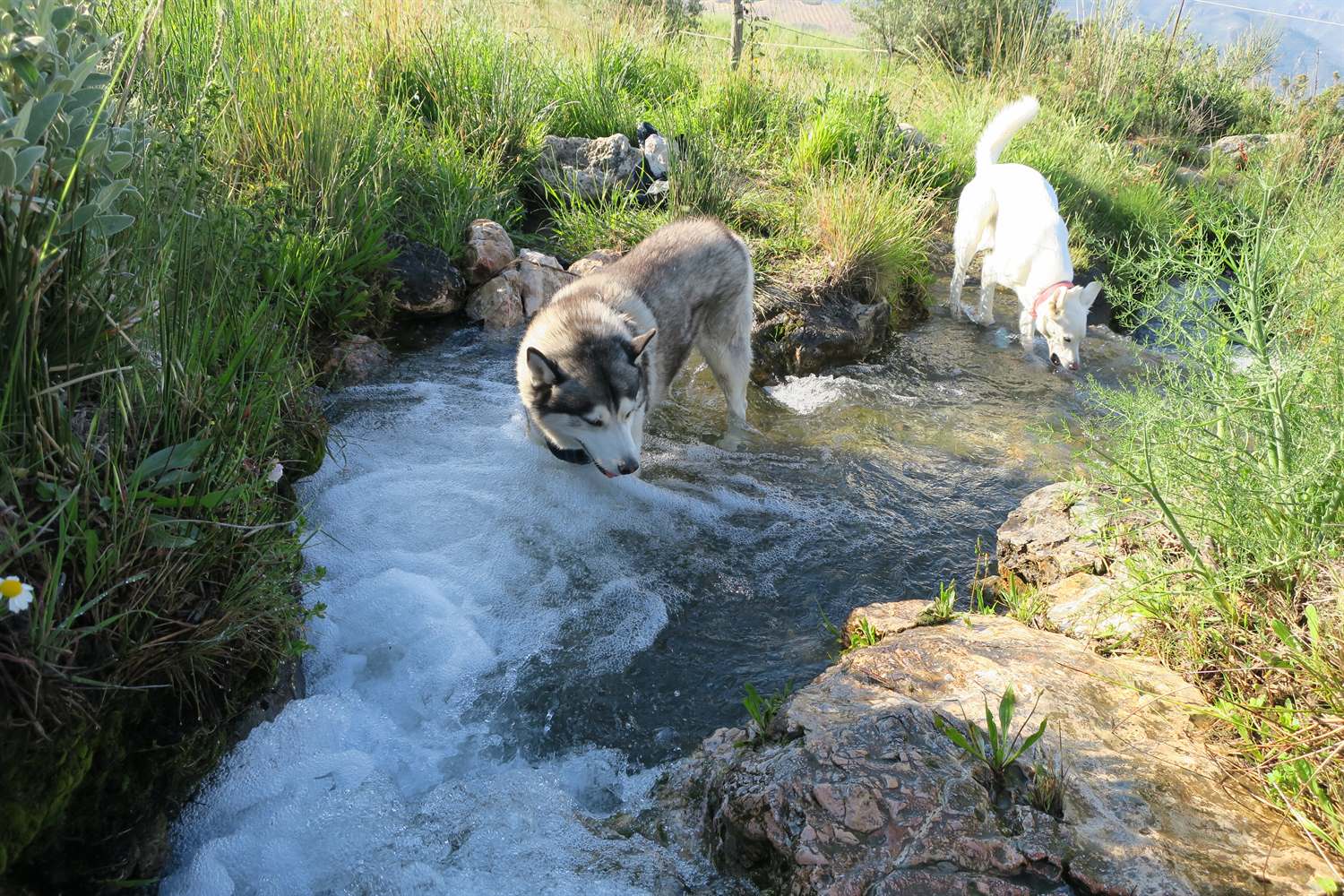 With temperatures rising to 28C (82F) today, our walk involved lots of water. We love to cool down in the water enroute. We are lucky to have the water flowing down from the Sierra Nevada mountains and into these irrigation channels. We know this won't last for the summer, just when we really need it. So we make the most of it for now.