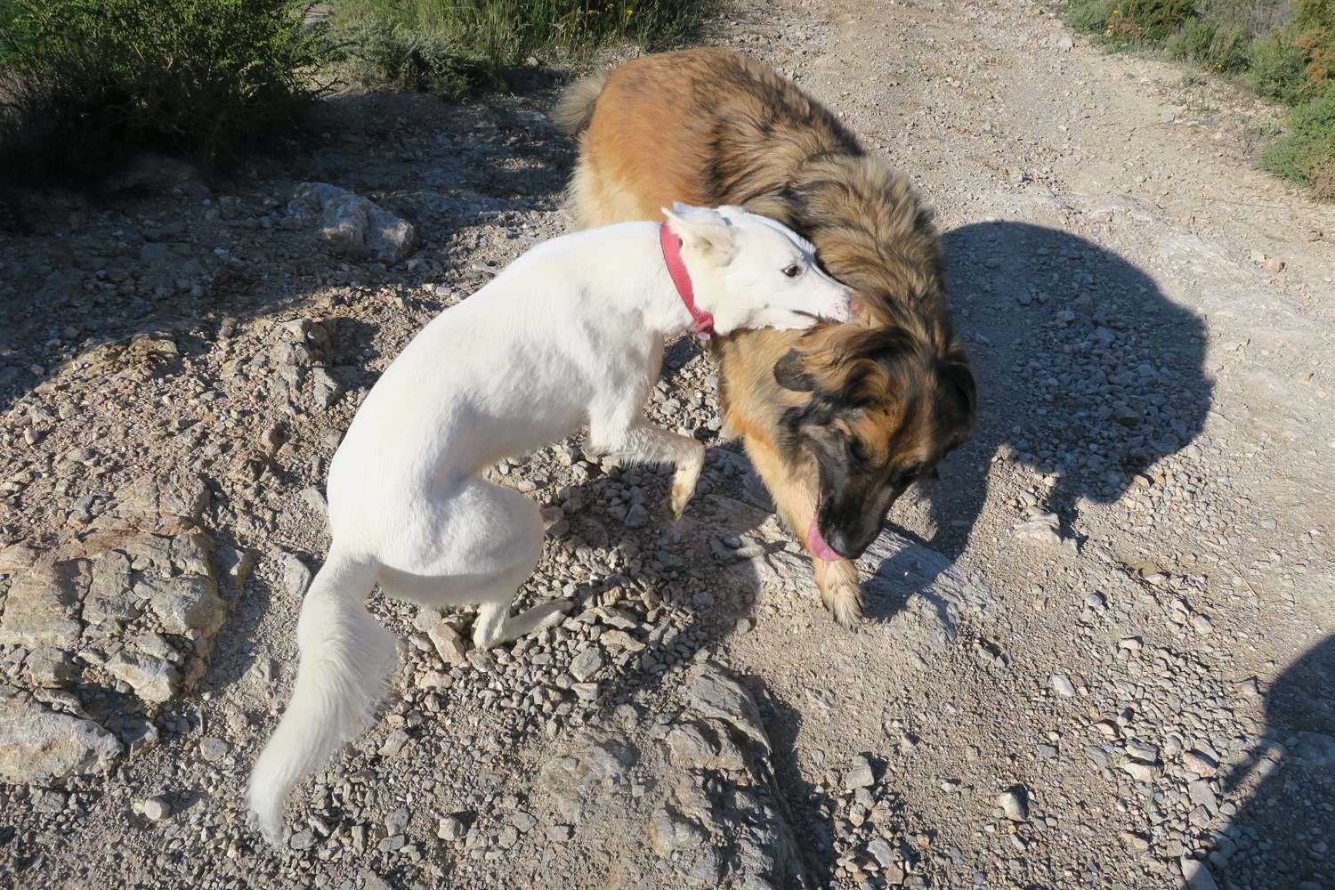 Kyra wondering why this annoying white dog keeps getting her