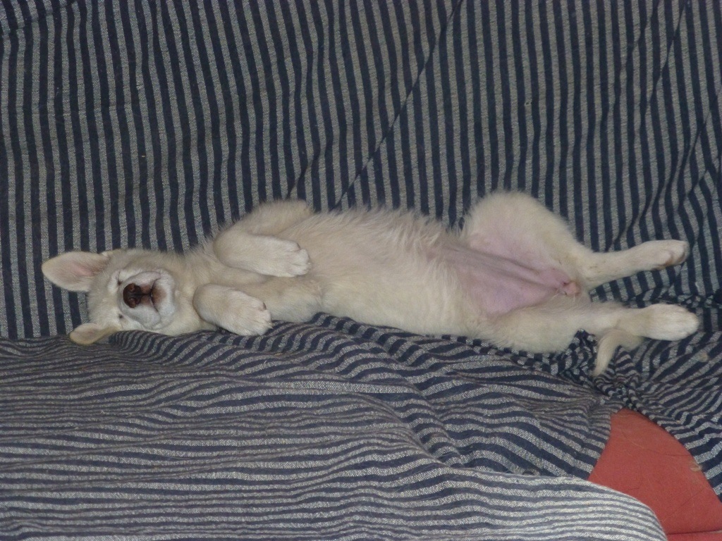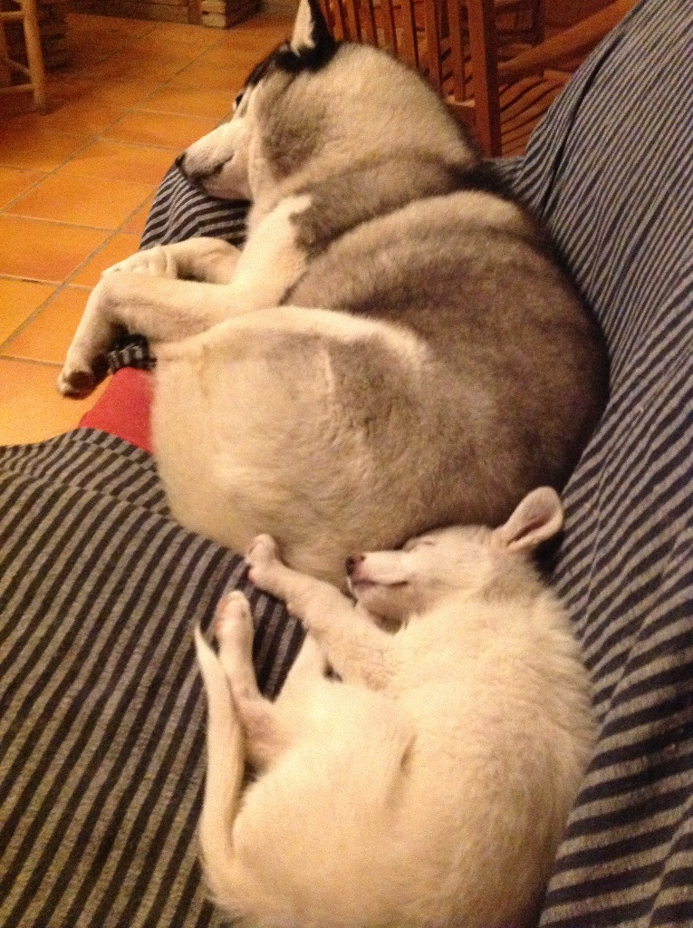 Teaching Rita how to sleep husky style. Excuse the hole in the sofa we have tried many times to restyle it!