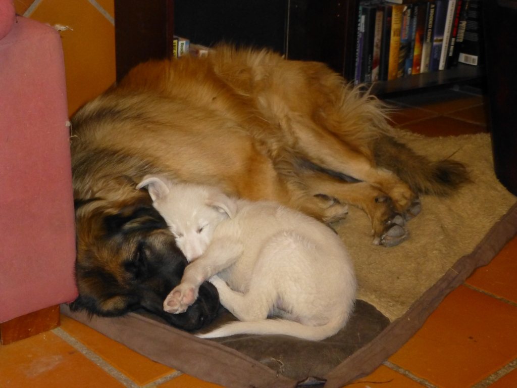 Trying to keep paws and tails away from Rita. This is what Kyra thinks to it!