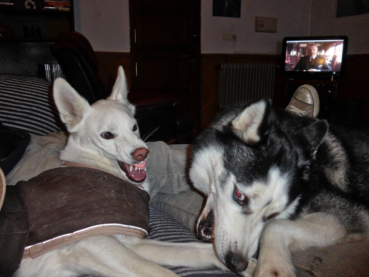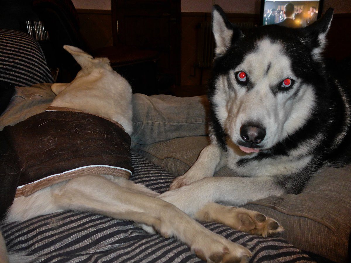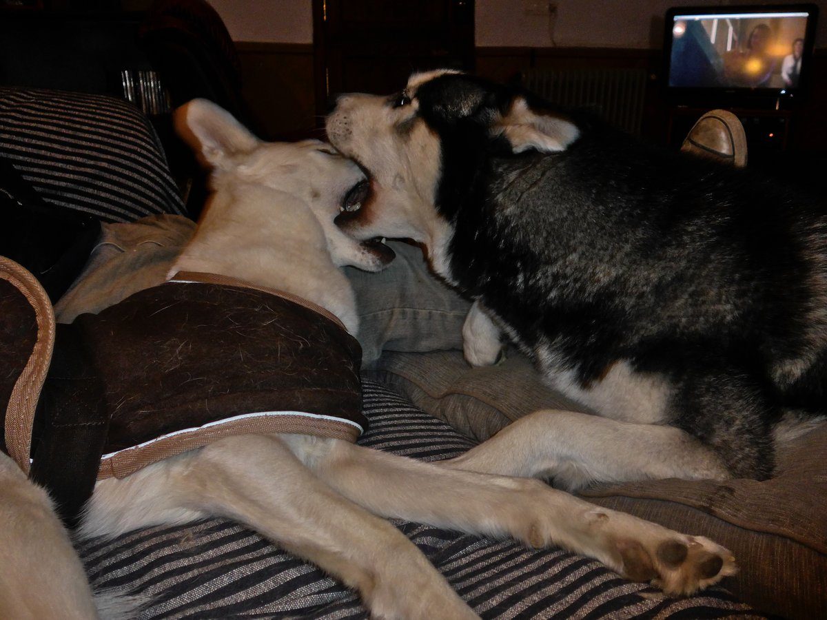 Rita was having cuddles on the sofa with the human's. It was cold, she was wearing her magic cape, all was calm.