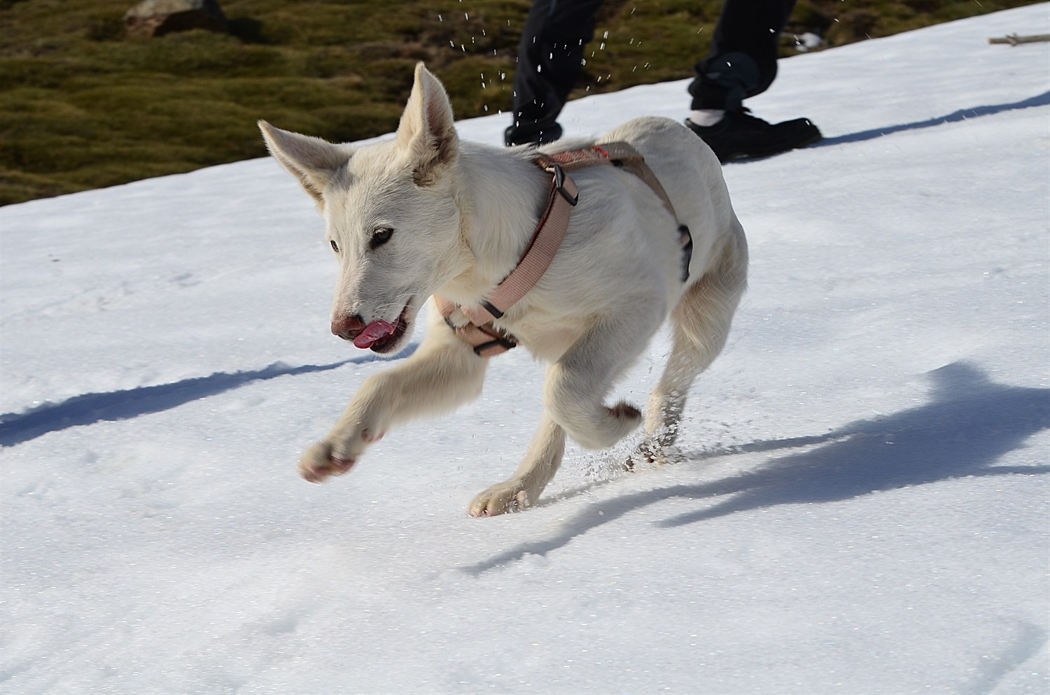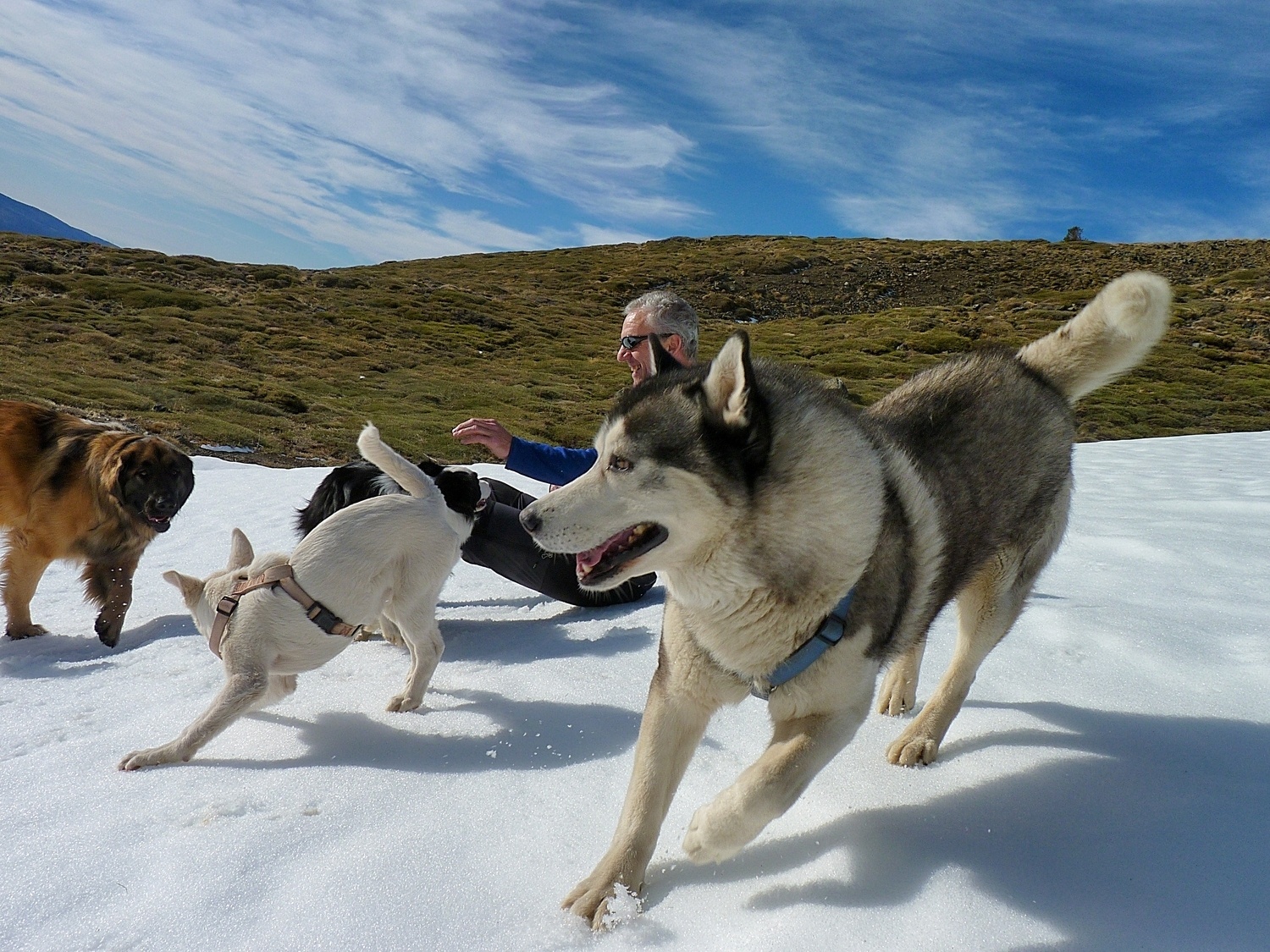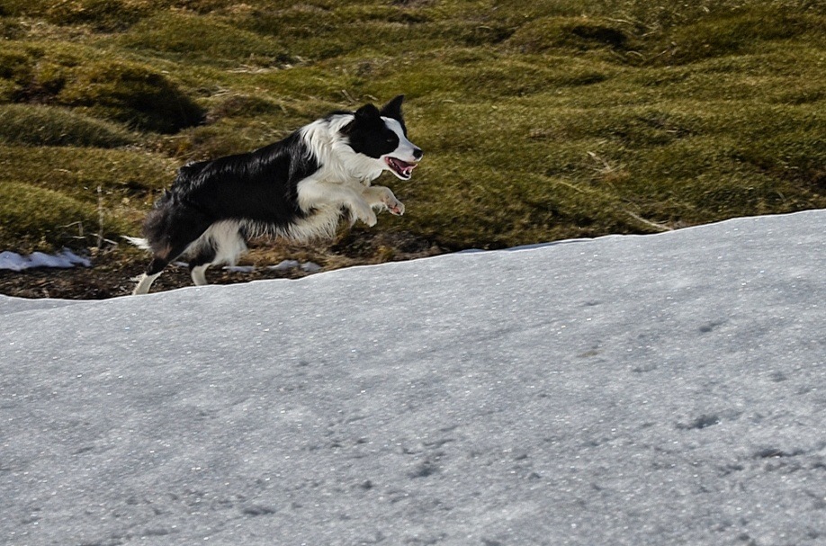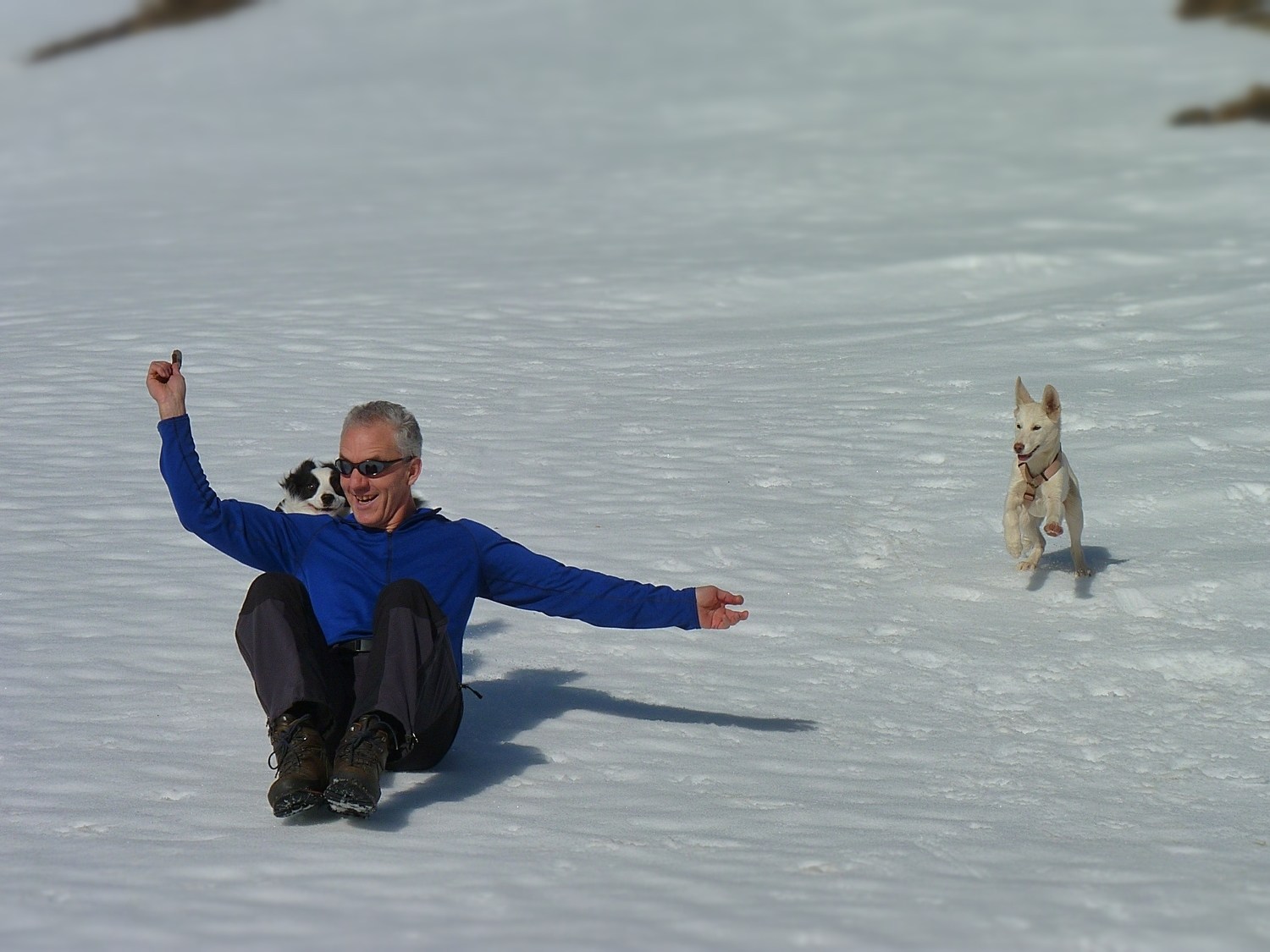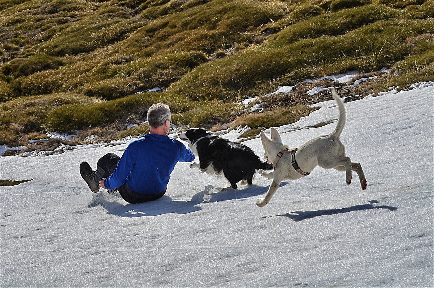 It's been a long time coming but eventually the hu'parents took us to the snow. We have had a serious lack of precipitation this winter so far and what snow has fallen has melted fast and a lot of what is left if ice and not good for us doggies. But we thought we should go to our favourite place and hope that we would find snow and that it would be soft enough for us to play in. This was Rita's first experience of snow and we were all looking forward to see what she would think of it. There were four humans and four doggies. The humans were the hu'parents, Pepe and Ian, the doggies were me (Khumbu), Kyra, Rita and Meg (the Border Collie). It goes without saying that we all had a blast as I'm sure you will see by all the pictures, there were humans and dogs everywhere. Sorry but there are a lot of photos.
