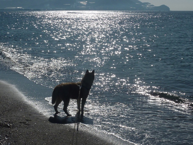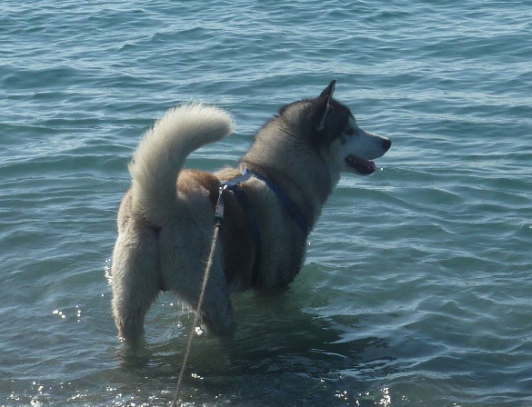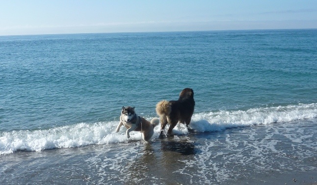 Hu'mum and Hu'dad kept saying they were going to take me and yesterday the weather was perfect, not too hot and not too cold. We all jumped into the pickup and away we went. Oh I had so much fun, me and Bruno ran straight to the sea. Neither of us swam but we went far enough out to get our tummys wet. I chased a few birds, sniffed everything and ran everywhere. They say you can see Africa on a clear day!! I was not allowed off my lead as there was too much space and many distractions for me to run away. There is a video below the photos, we hope you enjoy looking at them. Notice how my big brother Bruno will not allow me into the deeper water!